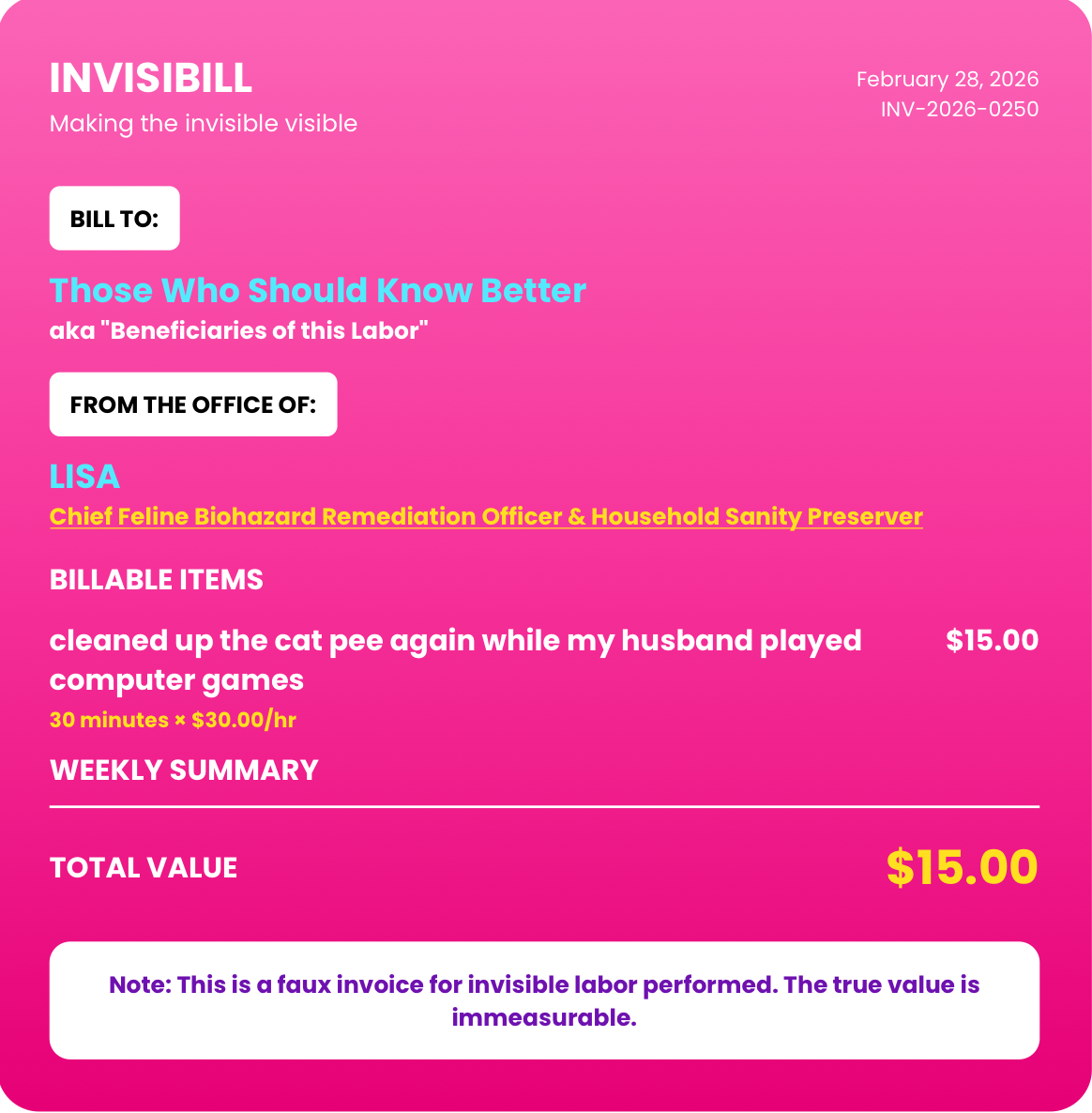 InvisiBILL – Anxiety Receipts is a wellness app that turns invisible labor, relational labor, emotional labor, and cognitive load into cathartic, humorous invoices and receipts. Designed for moments of burnout, anxiety, and everyday frustration, the app lets users log tasks, assign value, and generate shareable receipts for the work that often goes unseen. Download the InvisiBILL app on the App Store and Google Play.