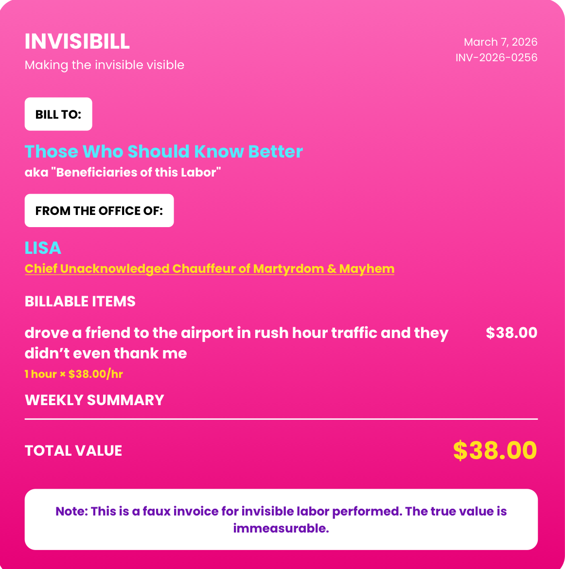 InvisiBILL finally puts a price on the little things you do that never get a “thank you.”